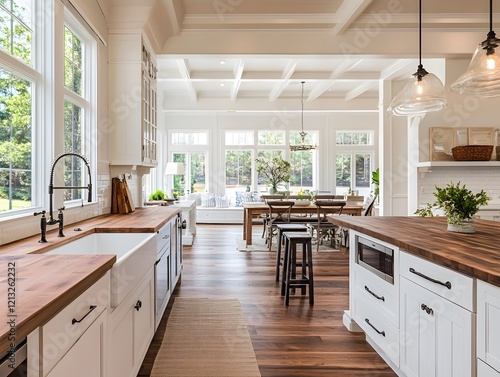 Fototapeta premium Bright Farmhouse Kitchen with Warm Wood Accents and Sunlit Views