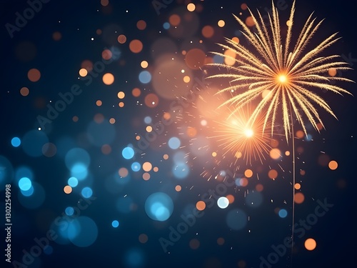 © Safwan Creatives, Obraz premium "Bright Fireworks Exploding Against a Dark Blue Background with Golden Sparks and Bokeh Light Effects, Creating a Festive Celebration Atmosphere"
