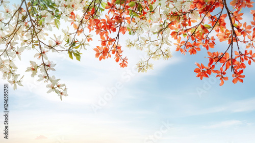 © Rachakrit, Fototapeta premium Bright floral branches with red and white flowers against blue sky