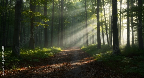 © Budi, Naklejka premium Bright Forest Pathway with Vibrant Greenery