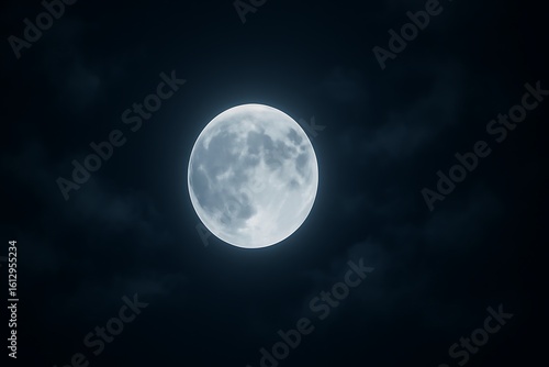 © Newton, Fototapeta premium Bright full moon glowing in dark night sky with soft clouds background