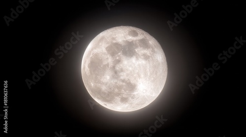 © Sylvia, Fototapeta premium Bright full moon rising in a clear night sky, showing sharp lunar textures and shadows.