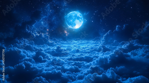© Bartek, Fototapeta premium Bright Full Moon Shining Above Night Clouds with Starry Sky, Majestic Nighttime View, Tranquil and Dreamy Night Sky Photography