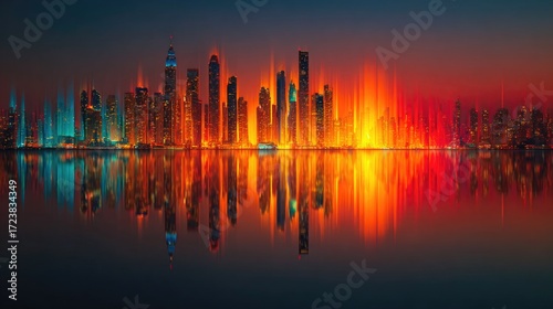 Fototapeta premium Bright futuristic city skyline with fiery neon reflections on water