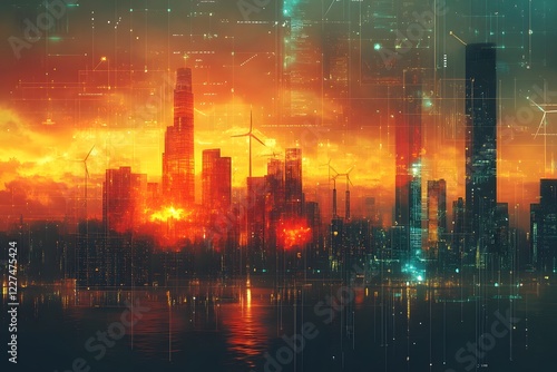 © milkyway, Fototapeta premium Bright Futuristic Cityscape Against Renewable Energy Climate Data Grid