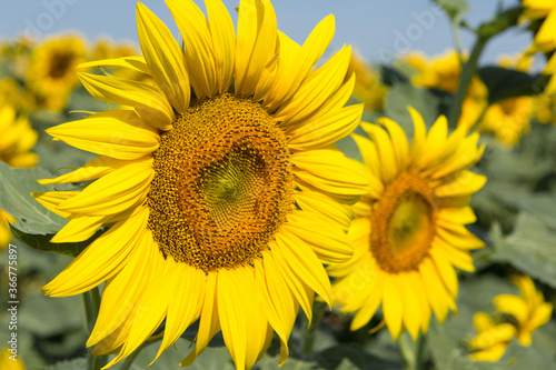 © Mountains Hunter, Fototapeta premium Bright golden sunflower field at sunset.