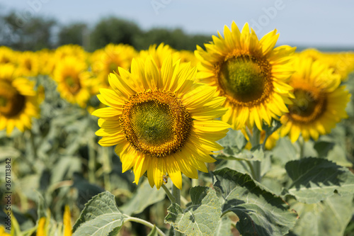 © Mountains Hunter, Fototapeta premium Bright golden sunflower field at sunset.