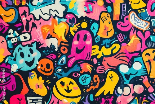 Obraz premium Bright graffiti doodles with smiles and quirky shapes on black.