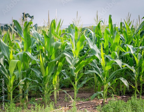 Obraz premium Bright green corn or maize grows abundantly in corn fields