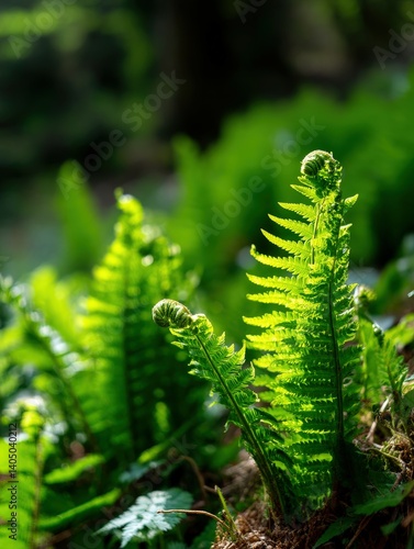 Naklejka premium Bright green fern fronds emerging in lush nature