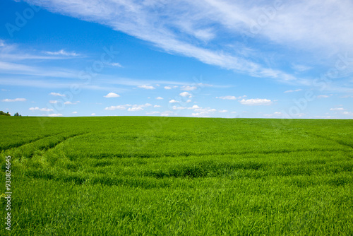 Fototapeta premium Bright green field and blue spring sky with clouds. Fresh thick grass. Countryside landscape.