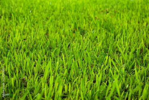 © Etnika, Obraz premium Bright green grass in macro close up with dry leaves..Nature background.