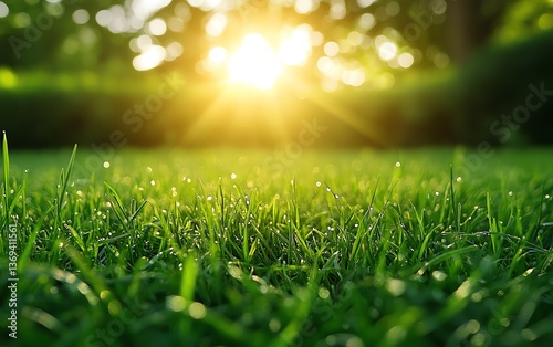 © Nattapat, Obraz premium Bright green grass meadow in summer sunlight, blurred wild field background with copy space for design or text integration