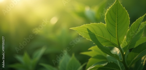 Fototapeta premium Bright green leaf in soft natural light with blurred background