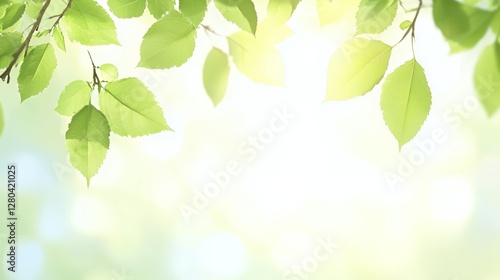 © Maftuhin, Naklejka premium Bright Green Leaves Background Sunlight Nature Spring