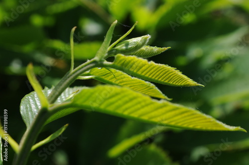 Naklejka premium Bright green leaves illuminated by summer light