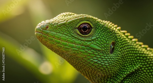 Fototapeta premium Bright green lizard headshot, detailed skin texture, soft blurred background