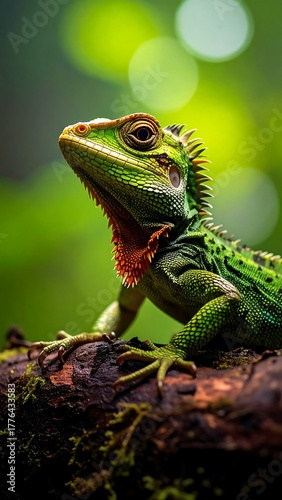 © Ah, Obraz premium Bright green lizard sits upon a mossy branch against blurred green foliage