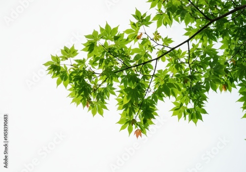 Fototapeta premium Bright green maple leaves on a branch against a white sky create a fresh,...