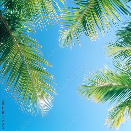 © Arthur Constantine, Naklejka premium Bright Green Palm Leaves Against a Vivid Blue Sky