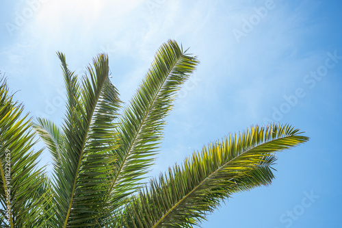 © Kufotos, Fototapeta premium Bright green palm leaves stretch upwards on a sunny day against a bright blue sky.