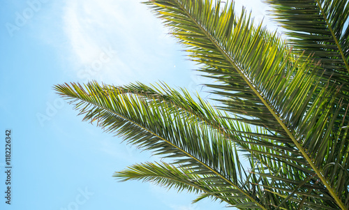 © Kufotos, Fototapeta premium Bright green palm leaves stretch upwards on a sunny day against a bright blue sky.