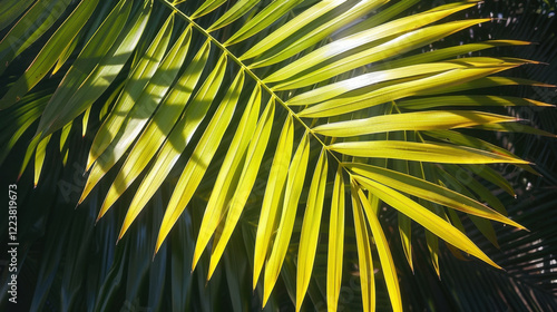 Obraz premium Bright green palm leaves with sunlight filtering through, creating vibrant...