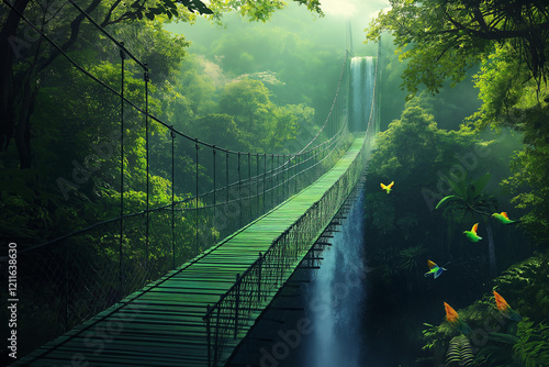 © Sekai, Obraz premium Bright Green Suspension Bridge Over a Misty Waterfall: A Stunning View