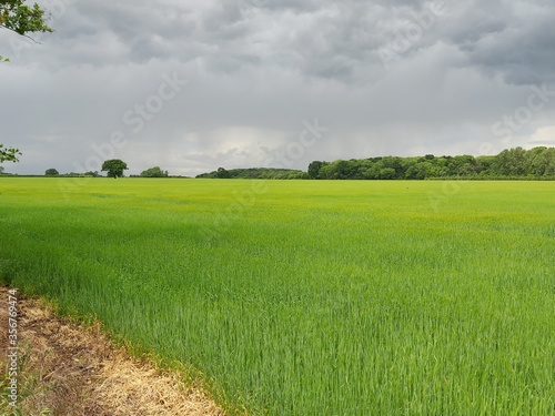 © Emma, Fototapeta premium Bright green wheat field with a grey sky in Peterborough, Cambridgeshire, UK