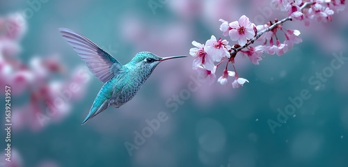 © Waqar, Fototapeta premium Bright hummingbird feeding softly under blossoms in starlit peace