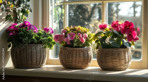 © Boonnam Burart, Obraz premium Bright Indoor Flower Pots on Sunlit Windowsill with Soft Shadows
