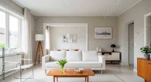 © Nature, Fototapeta premium Bright Interior Featuring a Comfortable White Sofa, Wooden Coffee Table, and Natural Light from the Window