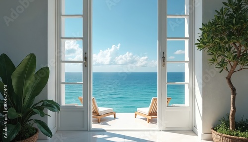 © Vadym, Fototapeta premium Bright interior view opens to blue ocean expanse with clear sky and fluffy clouds. Two loungers await on sunny terrace by sea. Rich green plants frame this tranquil vacation paradise.
