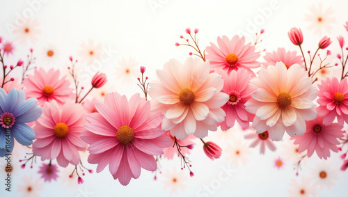 © Oksana, Naklejka premium Bright isolated composition of colorful flowers with green leaves on a white background.Colorful floral border for spring and summer themes