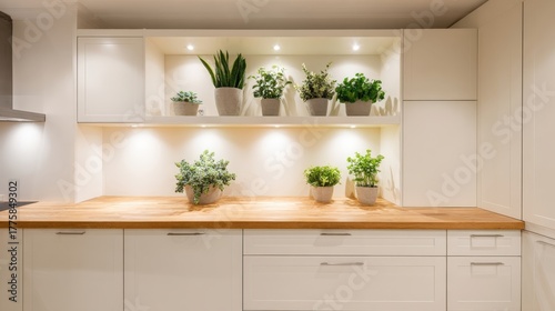 Fototapeta premium Bright Kitchen Decor Featuring Potted Plants on Wooden Countertop with White Cabinets and Soft Lighting