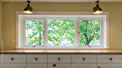 © lina, Fototapeta premium bright kitchen with white cabinets and window view of green trees