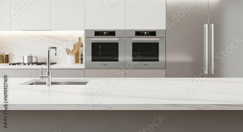 © Sob65, Fototapeta premium Bright kitchen with white countertops and stainless steel appliances.