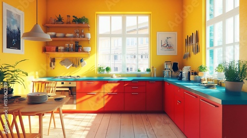 © EFA, Fototapeta premium Bright kitchen with yellow walls, red cabinets, and plants, inviting atmosphere.
