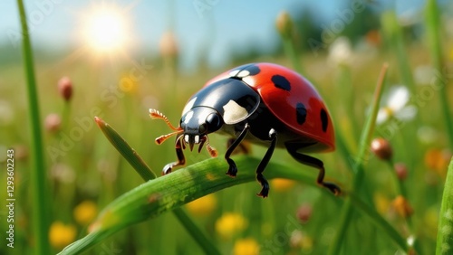 © sponge_Po, Fototapeta premium Bright ladybug exploring a green blade of grass on a sunny afternoon in a meadow