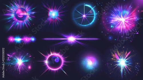 © ImageKing, Fototapeta premium Bright light beams, laser rays, neon glow effect. Abstract flares, color flashes of disco ball, party lights with rays isolated on transparent background, vector realistic set