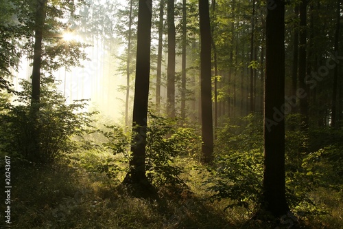 © Aniszewski, Fototapeta premium Bright light falling into the misty forest at dawn