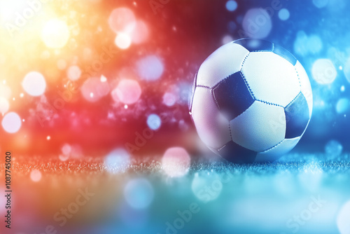 © nattawatstocker, Fototapeta premium Bright Light Reflection on a Soccer Ball in a Vibrant Field Setting with Colorful Bokeh Background for Sport and Activity Themes