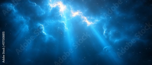 Naklejka premium Bright light shining through dark blue clouds.