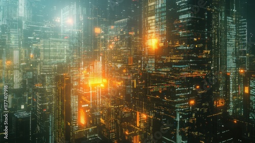 Fototapeta premium Bright lights illuminate the vibrant commercial skyline at night in an urban...