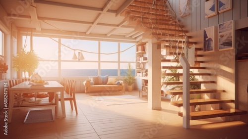 Fototapeta premium Bright living room in a villa by the sea. Dining area with table and chairs, relaxation area with sofa and bookshelves, wooden staircase to the second floor. Panoramic windows with Generative AI