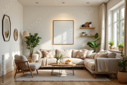 Fototapeta premium Bright Living Room Interior with Blank Frame