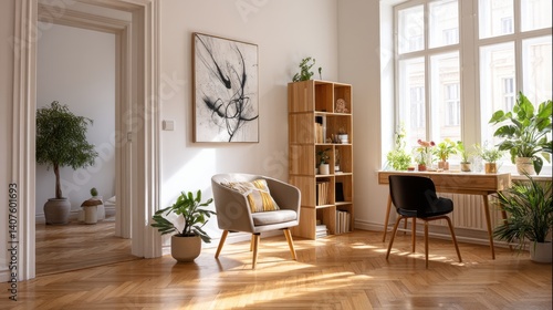Fototapeta premium Bright living room with armchair, bookshelf, and plants.