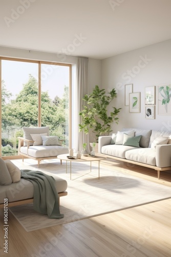 © Adobe Contributor, Fototapeta premium Bright living room with large windows and green plants