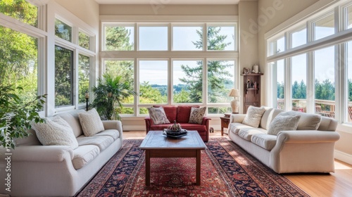 Fototapeta premium Bright living room with large windows offering scenic views and cozy seating.