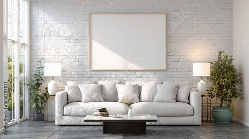 Fototapeta premium Bright living room with white brick wall, sofa, blank frame, side tables, plants, and window
